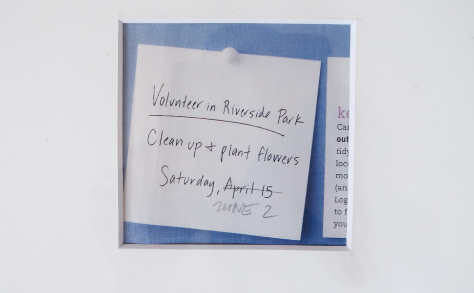 The photo shows a yellow sticky note with one of the possible recipes for a positive change